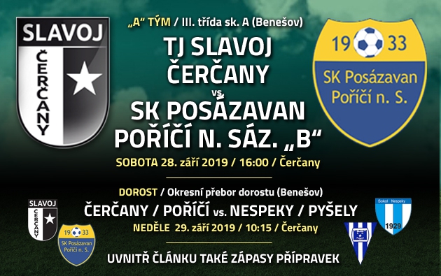 Tento víkend nebudou mít zápasy našeho áčka a dorostu o náboj nouzi. Na domácím hřišti se nejprve v sobotu od 16 hodin utká áčko s rezervou sousedního Poříčí nad Sázavou a následně v neděli přijde na řadu dorostenecké derby „na druhou“. V neděli od 10:15 se totiž náš spojený tým Čerčan a Poříčí také na našem hřišti utká se spojeným týmem Nespek a Pyšel. Je tedy jasné, že oba zápasy do kategorie těch „obyčejných“ opravdu nespadnou.