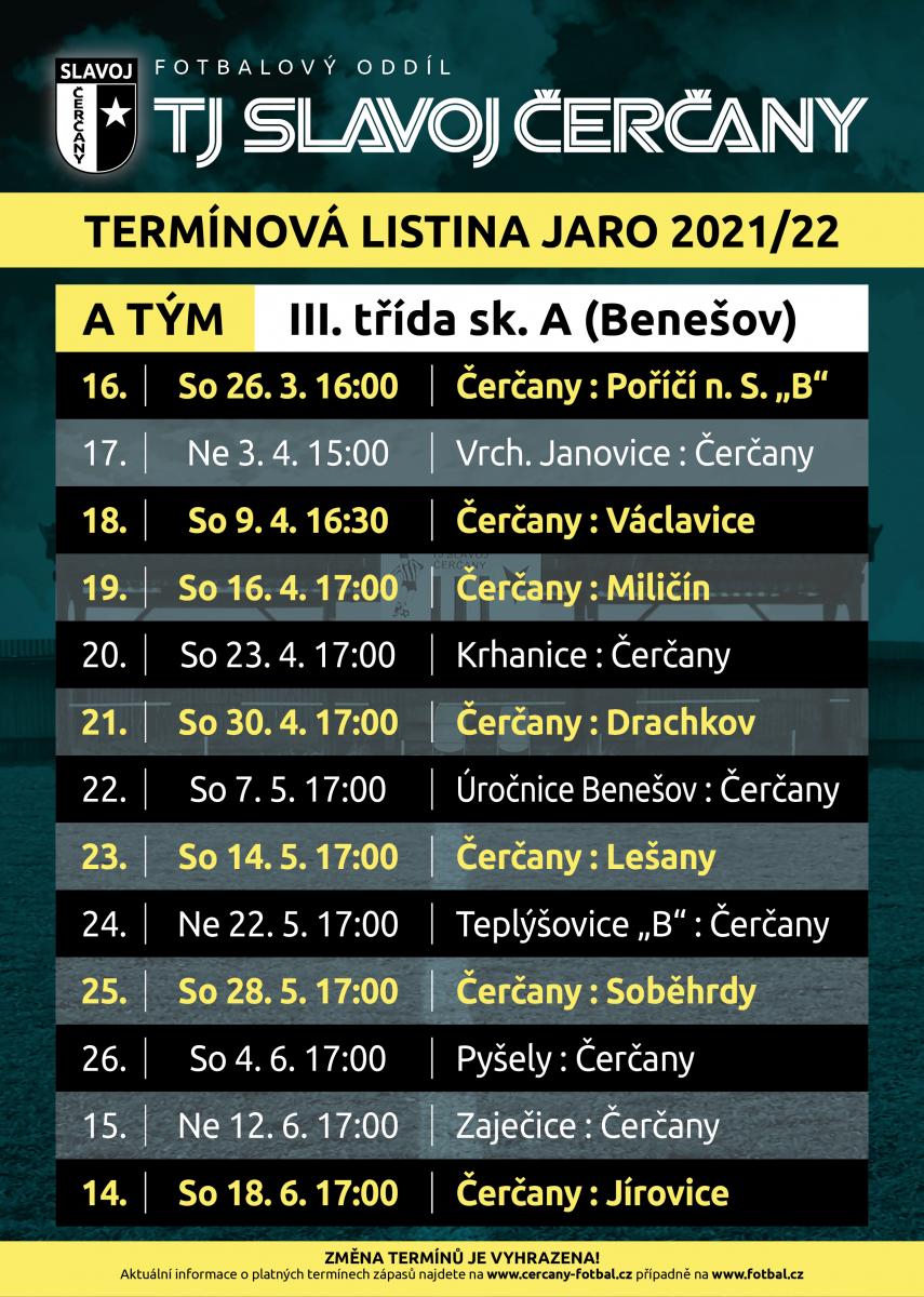 Čerčanským fotbalistům ještě ani pořádně nezačala společná zimní příprava a už vás můžeme pozvat na konkrétní termíny jarní části sezóny. Do té doby se samozřejmě ještě může ze všeobecně známých důvodů mnohé změnit, ale budeme věřit, že tyto termíny platit budou, a že se tentokrát odehrají všechny zápasy. Nezbývá než doufat, že dva předchozí nedokončené ročníky zůstanou navždy jen nezopakovanou nepříjemnou vzpomínkou.